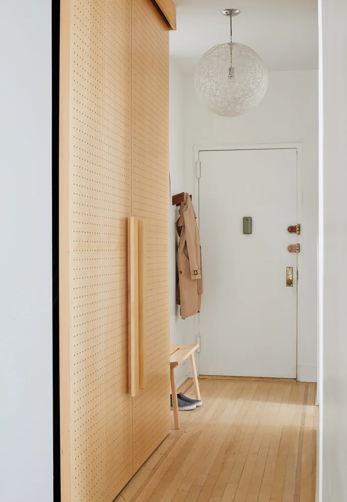 For this three-bedroom apartment steps away from Brooklyn’s Prospect Park, SJA created an airy, light-filled home from what had been a dimly lit and subdivided apartment. Strategic design changes rendered the space more coherent, more abundantly day lit, and increased its capacity for discreet storage. We expanded the kitchen, transforming a small galley kitchen into an open area linked to the dining room with the new waterfall marble countertop. We increased storage throughout the apartment by reconfiguring existing closets, and by creating several new storage walls--one, tucked behind custom sliding doors, and the other, hidden amidst a grid of panels. Boldly colored walls enliven the apartment and reflect the client’s appreciation for color, while wood floors, once a patchwork of different colors and materials, are made consistent, reinforcing a sense of cohesiveness to the space.